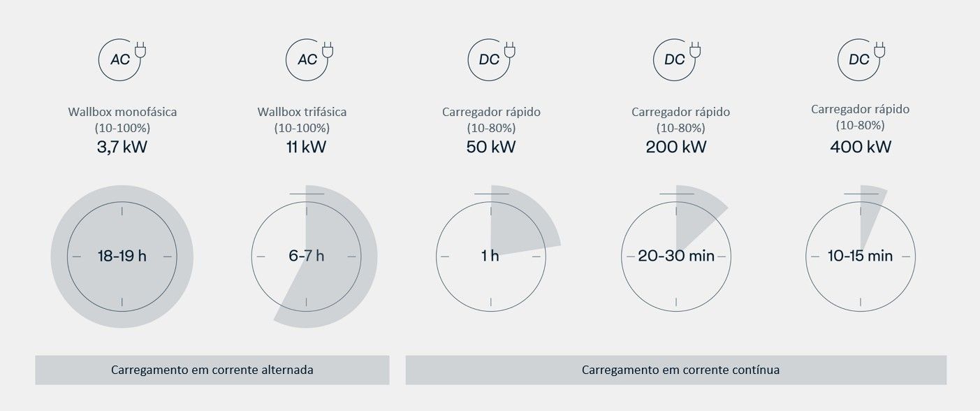 *Os tempos de carregamento fornecidos são exemplos de cálculos simplificados com base em veículos elétricos comuns. Na prática, o processo de carregamento não segue uma curva linear — semelhante ao carregamento de um smartphone. Especialmente com carregamento rápido, a potência diminui à medida que o nível de carga aumenta, pelo que muitas vezes faz mais sentido carregar apenas até cerca de 80% em longas distâncias, para poupar tempo e dinheiro. Além disso, vários fatores influenciam o tempo real de carregamento, incluindo a temperatura exterior, a temperatura da bateria, a potência de carregamento do veículo, o tamanho da bateria e a gestão térmica. Estes números servem apenas como orientação. Os valores indicados para DC baseiam-se numa estimativa mais conservadora e consideram uma curva de carga mais plana. Na realidade, é raro um veículo carregar constantemente à potência máxima DC. Especialmente na faixa superior do SOC (60-70%), a potência de carregamento tende a diminuir significativamente.