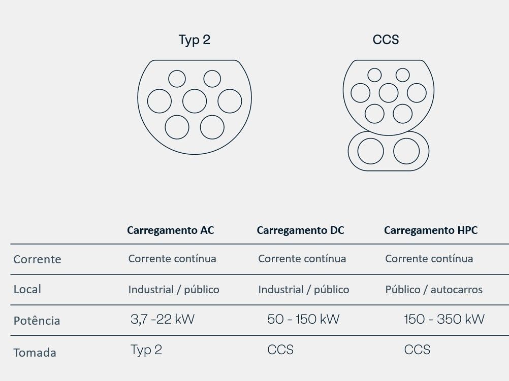 - CCS2: Carregamento DC de alta potência para BEV. Já as novas viaturas PHEV permitem carregar com CCS2.